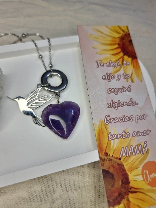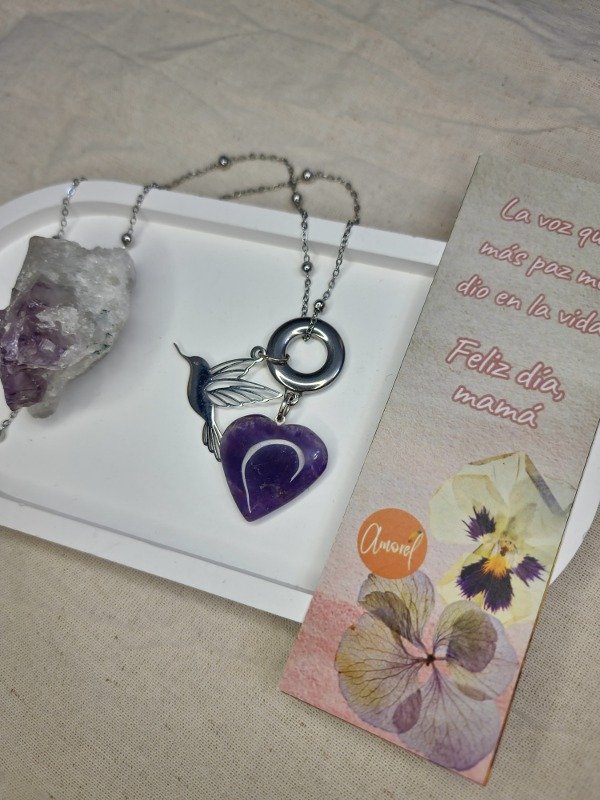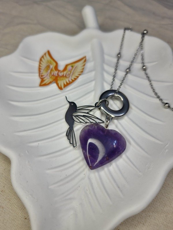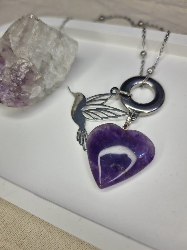 Collar con cadena, accesorios y Colibrí de acero 💫✨️ Corazón de Amatista 💜